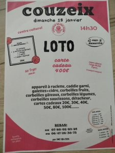 Rendez vous Dimanche 18 Janvier 2026 pour le Grand Loto du Couzeix Basket Club au centre culturel.